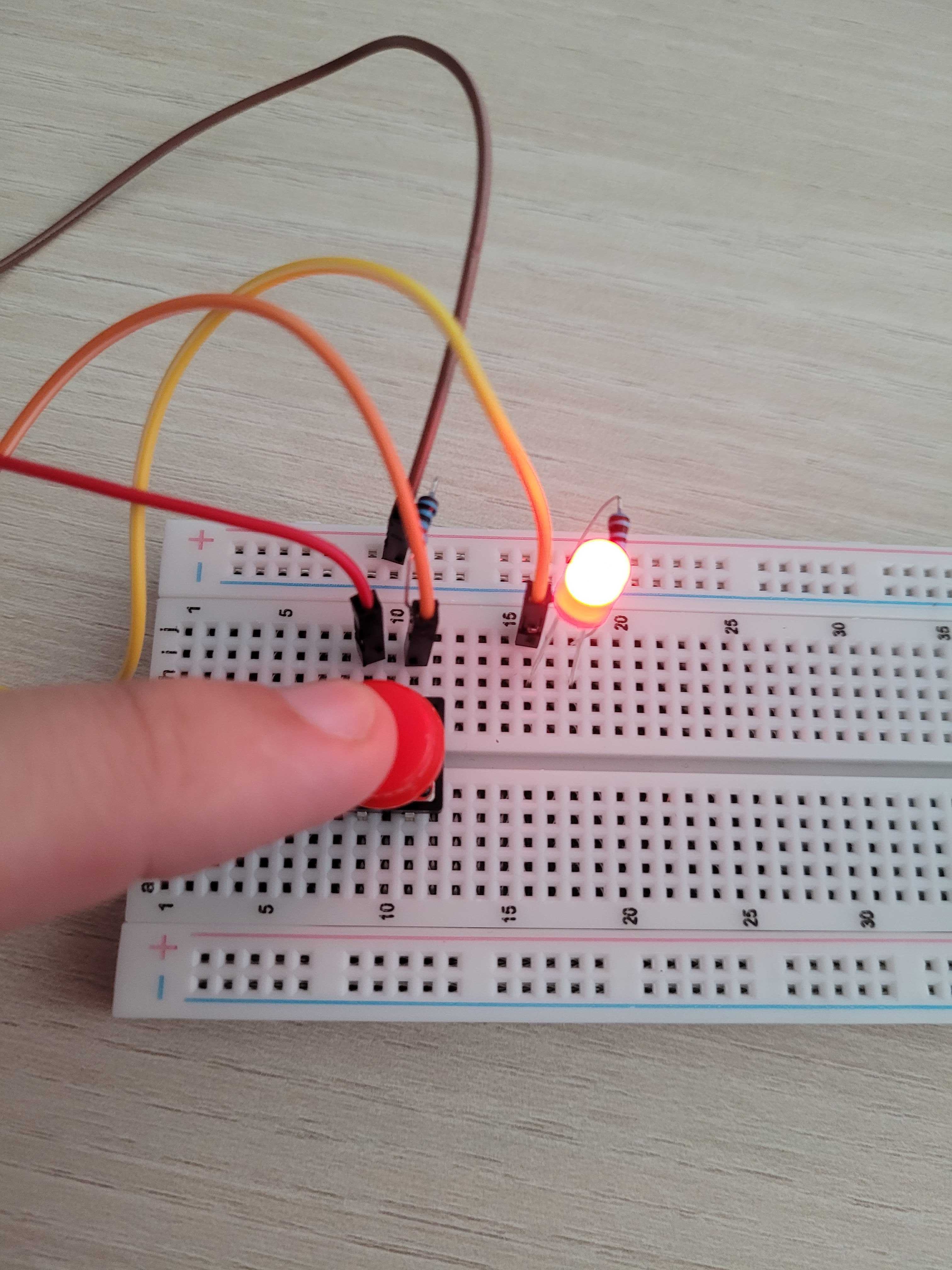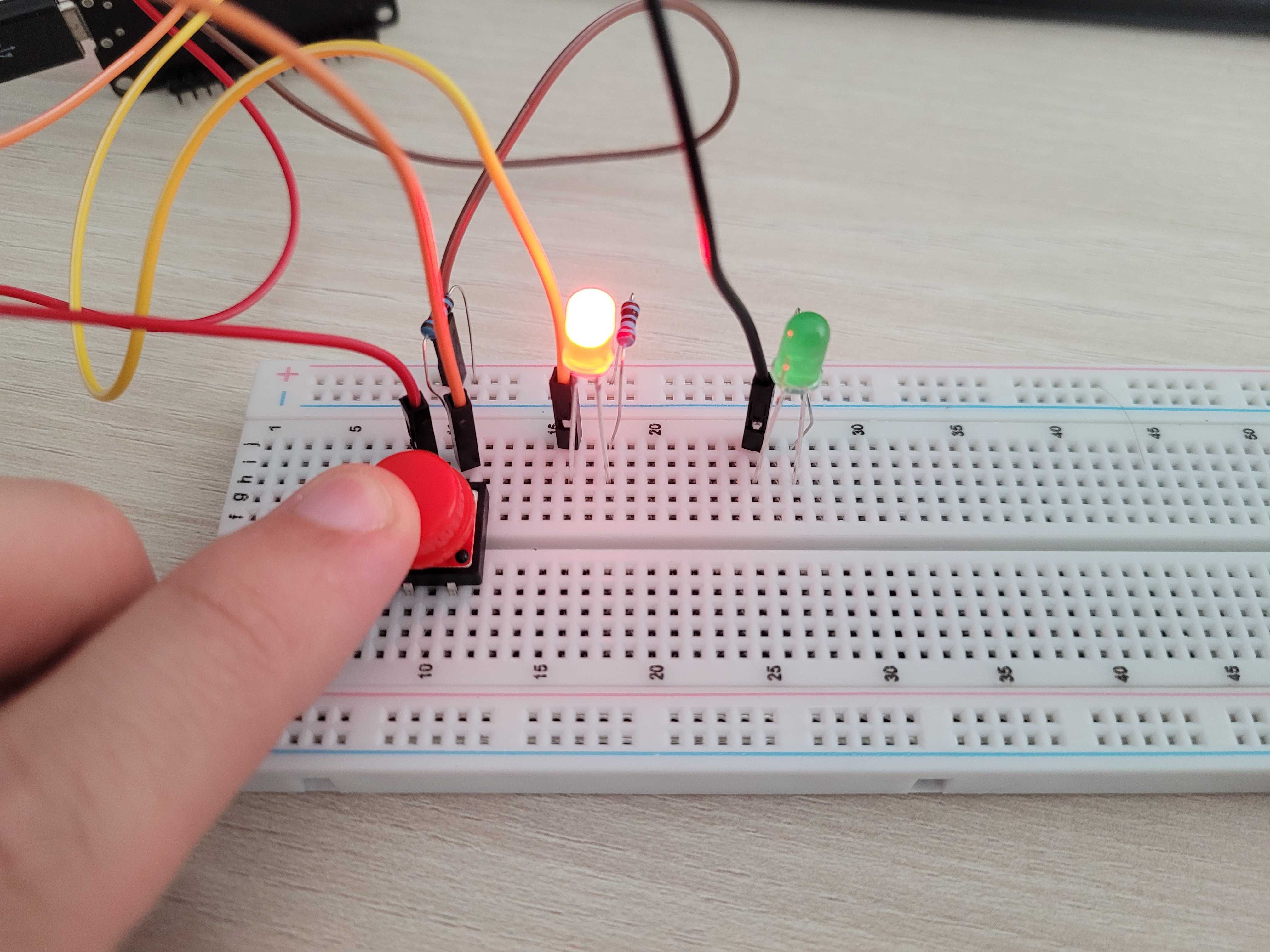 - When the button is pressed, the green LED turns off, and the red LED turns on.