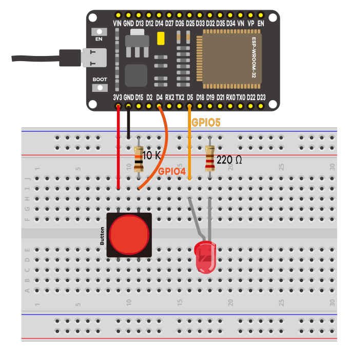 In the schematic, we use GPIO4 and GPIO5 to connect the button and the LED, respectively. This is reflected in the code:
