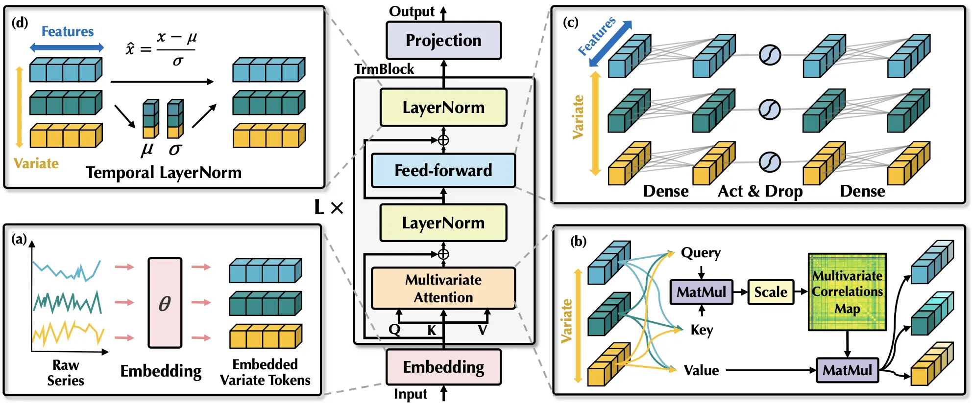 where represent the query, key, and value matrices derived from . This mechanism ensures that each variate token integrates information from all other variates, effectively capturing their dependencies.