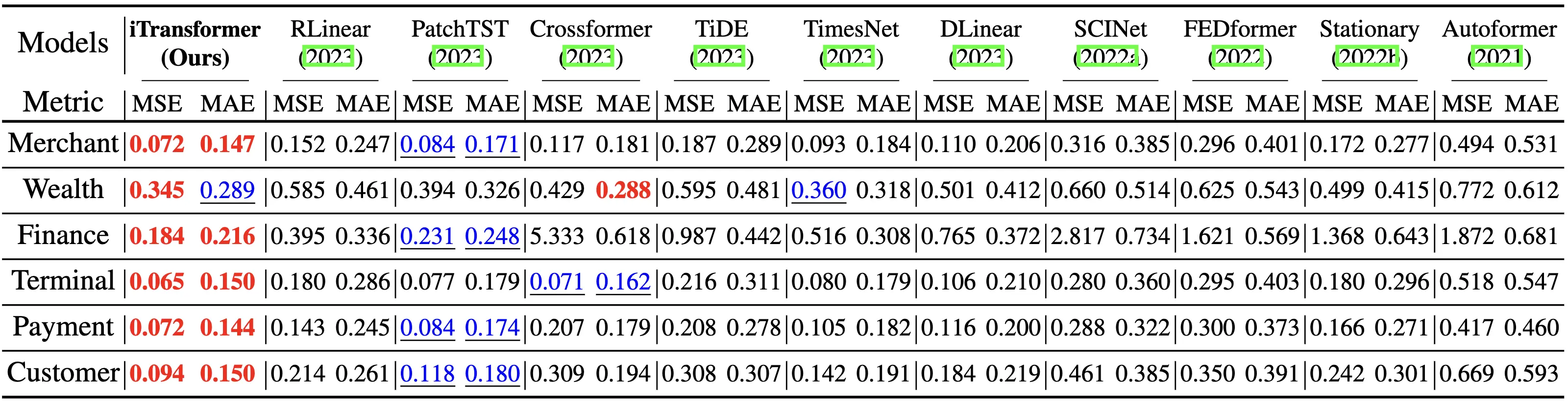 The iTransformer was evaluated on challenging multivariate forecasting benchmarks (generally hundreds of variates). The main result can be found in the table and further benchmarks under the GitHub repository of the original implementation. Comprehensive good performance (MSE/MAE ) is achieved.